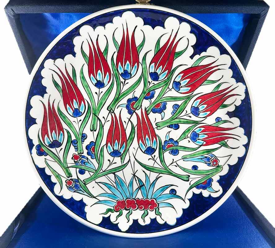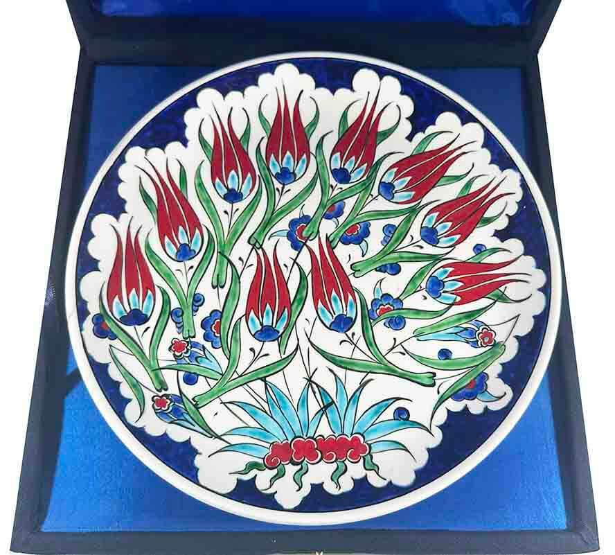 Yeni bir yuva kuran sevdiklerinize hem estetik hem de anlam taşıyan özel bir armağan sunmak istiyorsanız, bu Lale Bahçesi İznik Çini Tabak çok güçlü bir seçimdir. Kırmızı lale motiflerinin canlılığı, kobalt mavi zemin detayları ve klasik İznik kompozisyonu; eve bereket, zarafet ve sıcak bir enerji hissi katar.