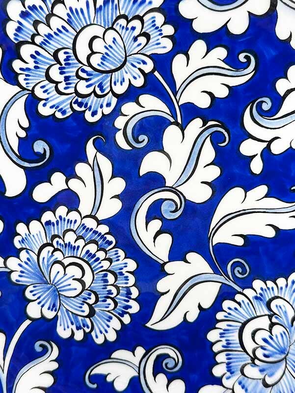 Çiçek motifleri İznik çini sanatında güzelliğin, zarafetin ve hayatın sürekliliğinin sembolüdür. Mavi zemin üzerine beyaz çiçekler, hem saflığı hem de huzuru yansıtır. Osmanlı çini sanatında bu tarz çiçek desenleri, estetik kaygının yanı sıra manevi bir dengeyi de temsil eder.