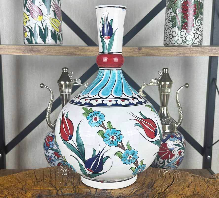 Her biri usta zanaatkârlar tarafından el işçiliğiyle boyanan bu vazo, sır altı tekniği ile üretilmiş ve 800–1000 °C arasında fırınlanarak renklerin kalıcılığı sağlanmıştır. El yapımı üretim süreci nedeniyle her parça kendine özgüdür; birebir aynısı tekrar üretilemez.