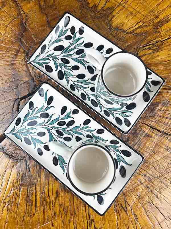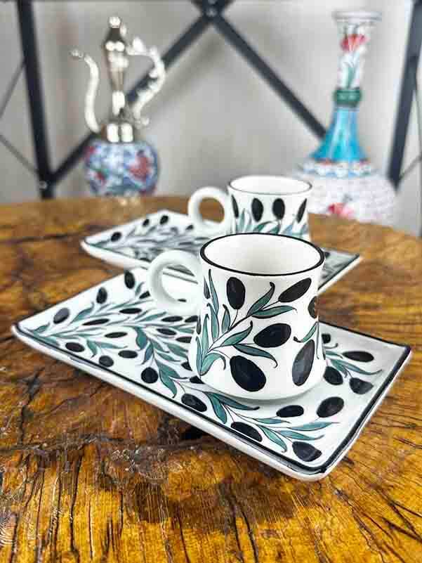 Zeytin Dalı Desenli Çini Kahve Sunum Seti – Kurumsal Tasarım, Akdeniz kültürünün en köklü sembollerinden biri olan zeytin dalını modern çini estetiğiyle buluşturur. Zeytin dalı; tarih boyunca barışın, bereketin, huzurun ve uzun ömrün simgesi olarak kabul edilmiştir. Bu anlamı taşıyan kompozisyon, ürünü yalnızca bir sunum seti olmaktan çıkarıp kurumsal hediye, özel sunum veya dekoratif kullanım için prestijli bir objeye dönüştürür.